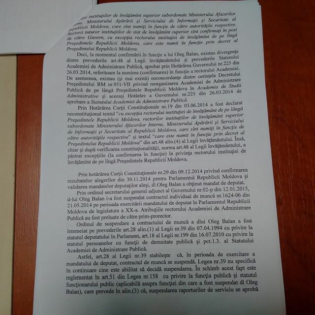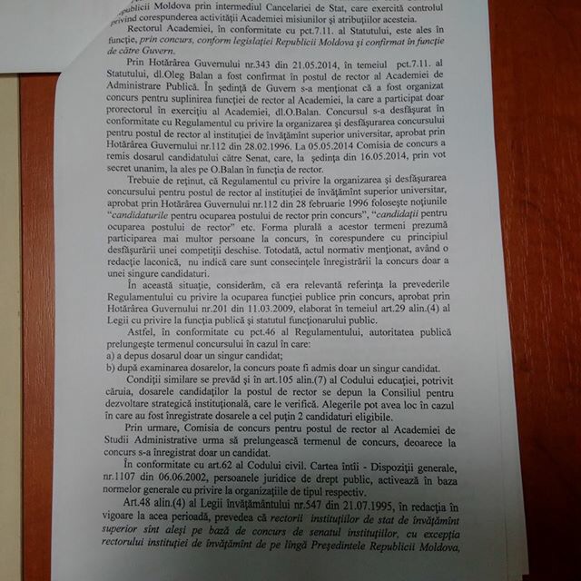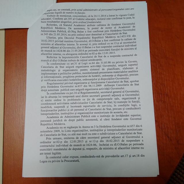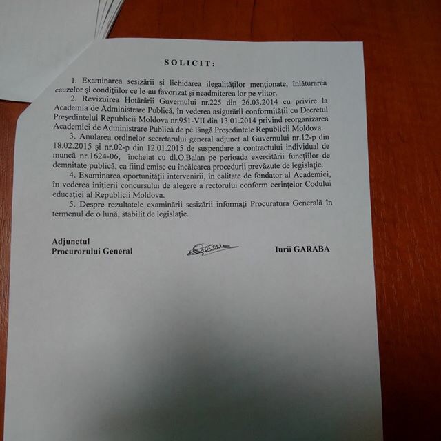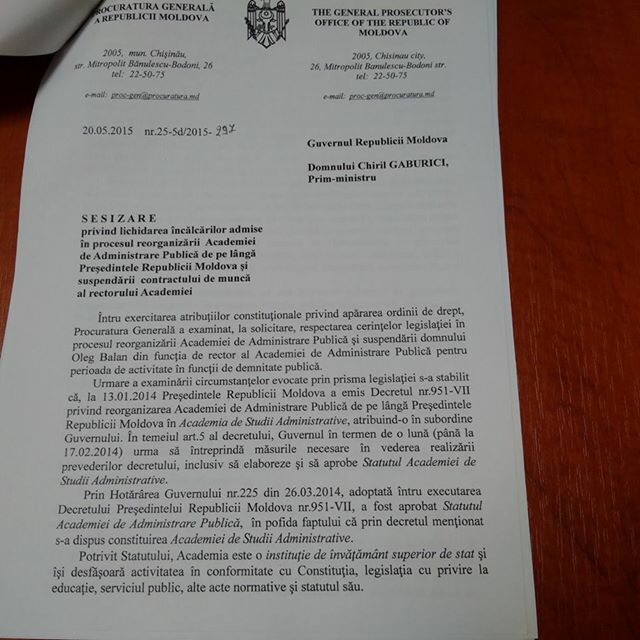 Prin sesizarea Procuraturii Generale din 20 mai 2015, se aduce la cunostinta premierului Gaburici despre ilegalitatile admise in procesul de numire a Rectorului Academiei, in urma caruia Balan a fost castigatorul.